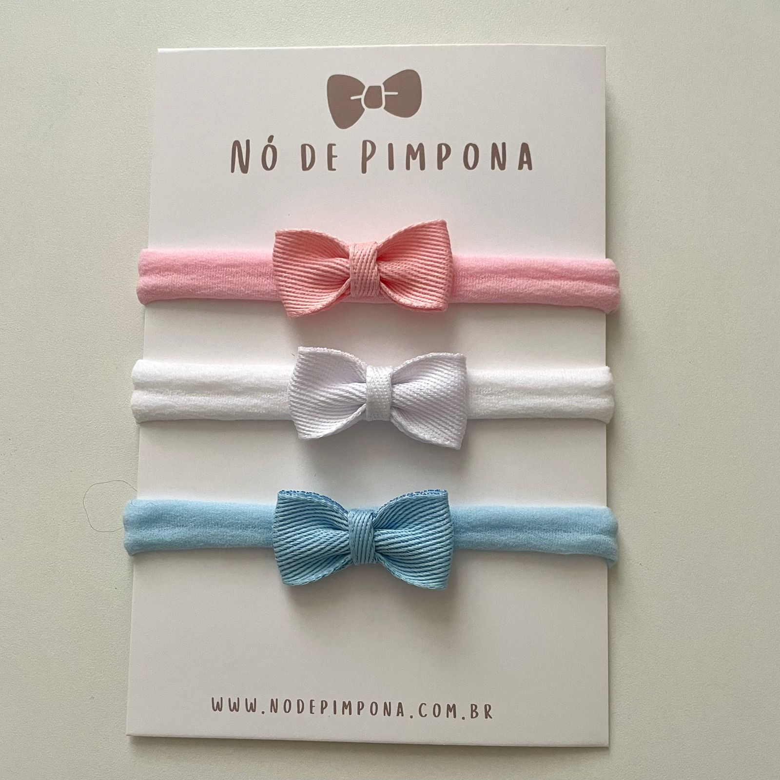 kIT Faixa Laço Mini Para Bebê Jeans - Azul, Rosa e Branco
